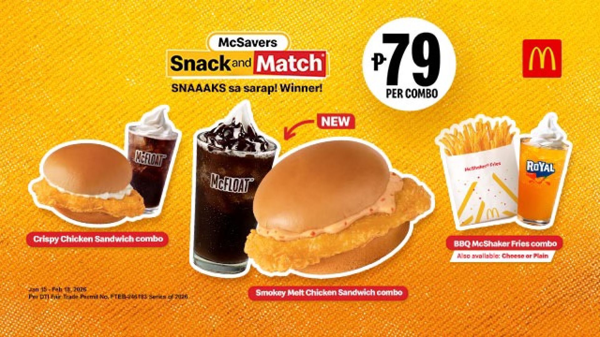 McSavers Snack and Match is available via Front Counter, Take-Out, SOK, and Drive-Thru only. Meanwhile, the Smokey Melt Chicken Sandwich is also available in other meal types via Front Counter, Take-Out, Self-Ordering Kiosks, Drive-Thru, McDelivery, and 3POs.